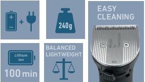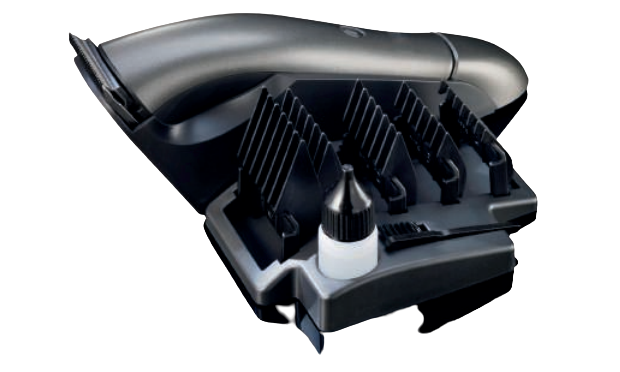 - incl. Ladestation, Kammhalter, 5 Aufsteckkämme (4, 8, 12, 16, 20 mm), Reinigungsbürste, Öl